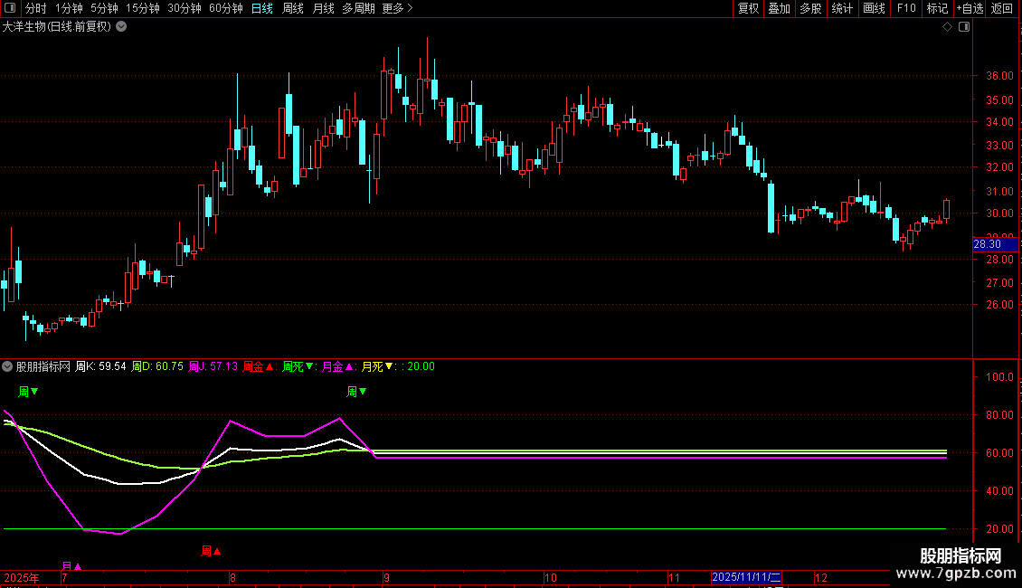 周死▼:DRAWTEXT(CROSS("KDJ.D#WEEK"(N,M1,M2),"KDJ.K#WEEK"(N,M1,M2)) ,92,'周▼'),COLORGREEN;