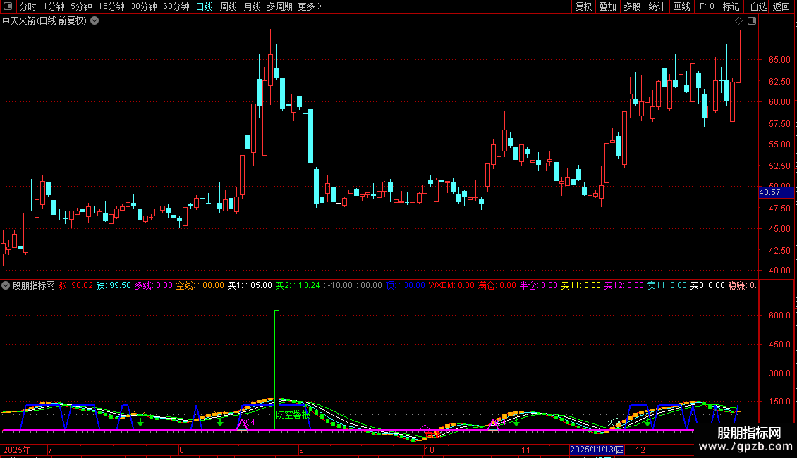 空线:IF(CROSS(跌,80),70,100),COLOR0099FF,LINETHICK1;
