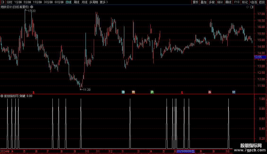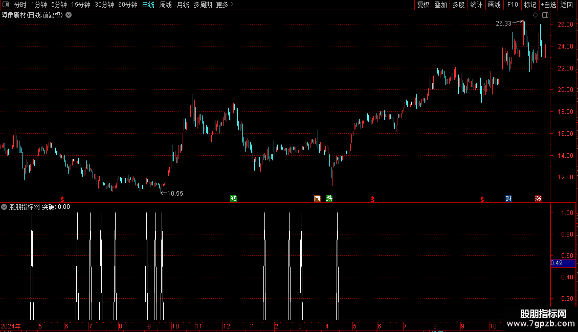 黑马线:=EMA(A1,5),LINETHICK2,COLOR6600FF;