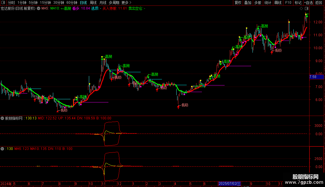 DRAWTEXT(CROSS(庄家,散户) AND 散户>70,H+0.05,'←高抛'),COLORGREEN;
