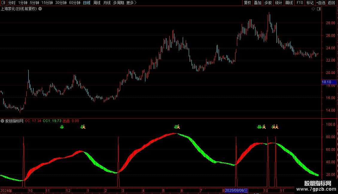 出击:IF((CROSS(CC,CC1) AND (CC1 < 顶) ),80,0),COLORRED;