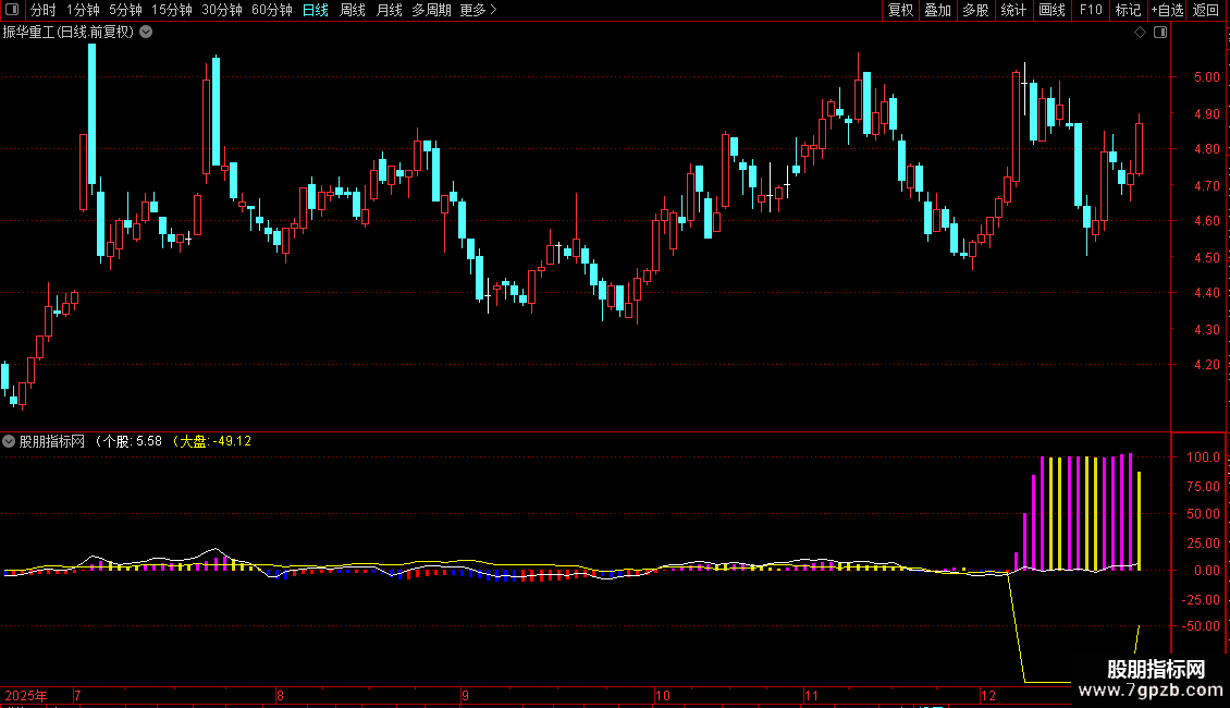 强弱值:=MA(个股-大盘,2),COLORSTICK;