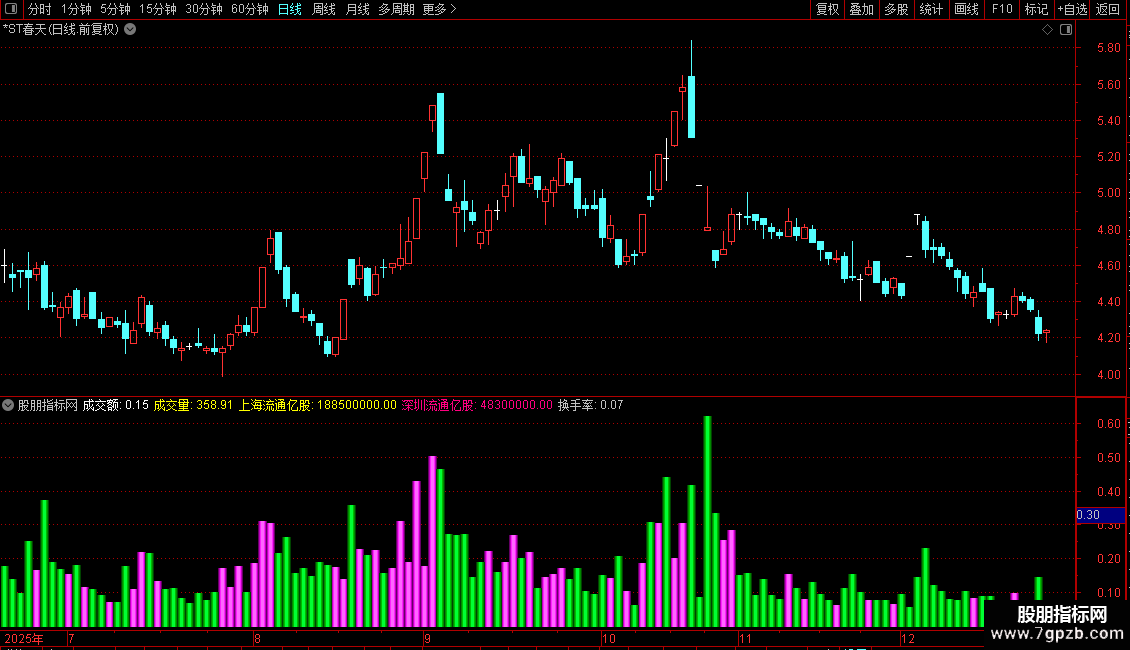 换手率:IF(上海流通亿股,V/DAPAN/100,IF(深圳流通亿股,V/DAPAN/100,DRAWNULL))NODRAW;