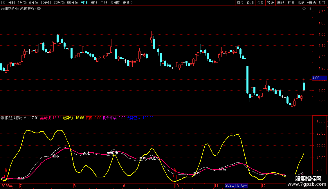 黑马线:EMA(A1,5),LINETHICK2,COLOR6600FF;