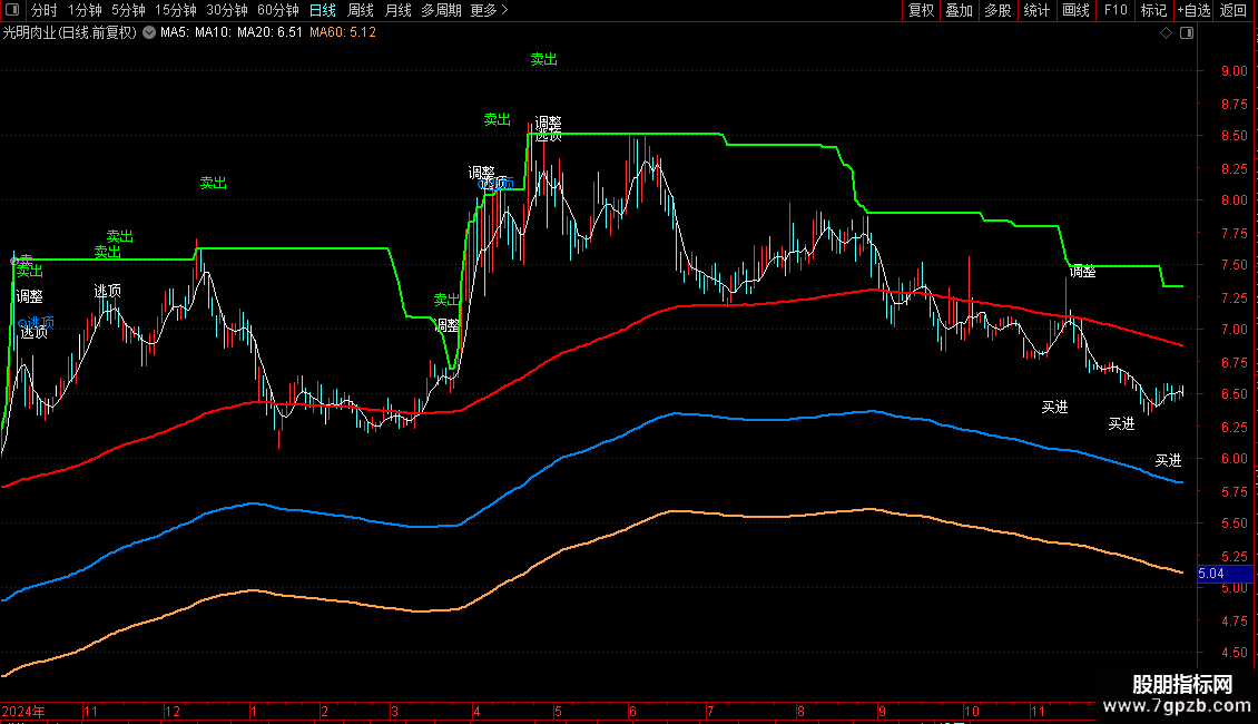 卖出提示包括输出的以下文字信号:调整、卖、卖出、逃、逃顶等。同样是根据股价运行情况决定仓位