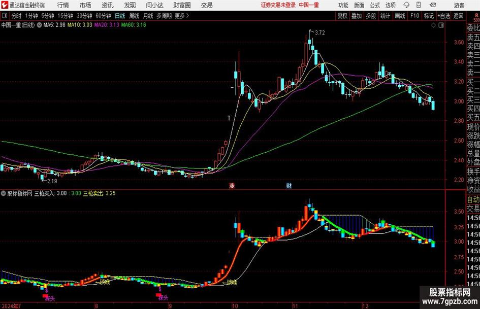 STICKLINE(三枪卖出>SMA2 AND B2<SMA2,三枪卖出,SMA2,0,1),COLORBLUE;