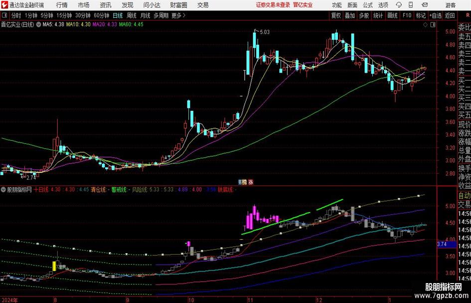 STICKLINE(O>=C,H,L,0,0),COLOR909090;STICKLINE(O>=C,C,O,3.1,0),COLOR606060;STICKLINE(O>=C,C,O,2.1,0),COLOR707070;STICKLINE(O>=C,C,O,1.2,0),COLOR808080;STICKLINE(O>=C,C,O,0.2,0),COLOR909090;STICKLINE(O<=C,H,L,0,0),COLOR666B6F;STICKLINE(C>O,C,O,3.1,1),COLOR666B6F;V2V:=V/REF(V,1)>=1.9 AND C>REF(C,1);十日线:MA(C,10),DOTLINE,COLORRED;IF(十日线>=REF(十日线,1),十日线,DRAWNULL),COLORRED;IF(十日线< REF (十日线,1),十日线,DRAWNULL),COLORFF8000;六十日:=MA(C,60);IF(六十日>=REF(六十日,1),六十日,DRAWNULL),COLOR808000,LINETHICK2;IF(六十日< REF (六十日,1),六十日,DRAWNULL),COLORGREEN,DOTLINE;清仓线:IF(C>MA(C,60)*1.5,MA(C,60)*1.5,DRAWNULL),COLOR0080FF,LINETHICK5;警戒线:IF(C>MA(C,60)*1.2,MA(C,60)*1.3,DRAWNULL),COLORGREEN,DOTLINE,LINETHICK2;风险线:MA(C,60)*1.2,COLORBROWN,;IF(风险线>=REF(风险线,1),风险线,DRAWNULL),COLORBROWN;IF(风险线< REF (风险线,1),风险线,DRAWNULL),COLORGREEN,DOTLINE;上枢:=MA(C,60)*1.1,COLORLIGREEN;IF(上枢>=REF(上枢,1),上枢,DRAWNULL),COLORFF0080;IF(上枢< REF (上枢,1),上枢,DRAWNULL),COLORGREEN,DOTLINE;下枢:=MA(C,60)*0.9,COLORLIMAGENTA,;IF(下枢>=REF(下枢,1),下枢,DRAWNULL),COLORLIMAGENTA;IF(下枢< REF (下枢,1),下枢,DRAWNULL),COLORGREEN,DOTLINE;底线:=MA(C,60)*0.8,COLORBLUE;IF(底线>=REF(底线,1),底线,DRAWNULL),COLORBLUE;IF(底线< REF (底线,1),底线,DRAWNULL),COLORGREEN,DOTLINE;铁底线:IF(C< MA(C,60)*0.8,MA(C,60)*0.7,DRAWNULL),COLORRED,LINETHICK5;CM:=REF(C,1);涨停:=IF((C-CM)*100/CM>=9.89,1,0);STICKLINE(涨停,C,O,3.1,0),COLOR009999;STICKLINE(涨停,C,O,2.5,0),COLOR00AAAA;STICKLINE(涨停,C,O,2,0),COLOR00BBBB;STICKLINE(涨停,C,O,1.5,0),COLOR00CCCC;STICKLINE(涨停,C,O,1,0),COLOR00DDDD;STICKLINE(涨停,C,O,0.5,0),COLOR00EEEE;STICKLINE(涨停,C,O,0.1,0),COLOR00FFFF;中位警戒线定位:=O>警戒线;STICKLINE(中位警戒线定位=1,L,H,0.0,0),COLORFF55FF;STICKLINE(中位警戒线定位=1,C,O,3.2,0),COLOR770077;STICKLINE(中位警戒线定位=1,C,O,2.7,0),COLOR990099;STICKLINE(中位警戒线定位=1,C,O,2.1,0),COLORBB00BB;STICKLINE(中位警戒线定位=1,C,O,1.5,0),COLORDD00DD;STICKLINE(中位警戒线定位=1,C,O,0.9,0),COLORFF00FF;STICKLINE(中位警戒线定位=1,C,O,0.2,0),COLORFF55FF;高位警戒线定位:=L>清仓线;STICKLINE(高位警戒线定位=1,L,H,0.0,0),COLORGREEN;STICKLINE(高位警戒线定位,O,C,3.2,0),LINETHICK2,COLOR005500;STICKLINE(高位警戒线定位,O,C,3.0,0),LINETHICK2,COLOR007700;STICKLINE(高位警戒线定位,O,C,2.5,0),LINETHICK2,COLOR009900;STICKLINE(高位警戒线定位,O,C,2.0,0),LINETHICK2,COLOR00AA00;STICKLINE(高位警戒线定位,O,C,1.5,0),LINETHICK2,COLOR00DD00;STICKLINE(高位警戒线定位,O,C,0.5,0),LINETHICK2,COLOR00FF00;低位警戒线定位:=L>铁底线;STICKLINE(低位警戒线定位=1,L,H,0.0,0),COLOR009999;STICKLINE(低位警戒线定位=1,C,O,3.2,0),COLOR009999;STICKLINE(低位警戒线定位=1,C,O,2.7,0),COLOR00AAAA;STICKLINE(低位警戒线定位=1,C,O,2.1,0),COLOR00BBBB;STICKLINE(低位警戒线定位=1,C,O,1.5,0),COLOR00CCCC;STICKLINE(低位警戒线定位=1,C,O,0.9,0),COLOR00DDDD;STICKLINE(低位警戒线定位=1,C,O,0.2,0),COLOR00EEEE;低位警戒线定位1:=L< 铁底线;STICKLINE(低位警戒线定位1=1,L,H,0.0,0),COLOR0000EE;STICKLINE(低位警戒线定位1=1,C,O,3.2,0),COLOR000055;STICKLINE(低位警戒线定位1=1,C,O,2.7,0),COLOR000077;STICKLINE(低位警戒线定位1=1,C,O,2.1,0),COLOR000099;STICKLINE(低位警戒线定位1=1,C,O,1.5,0),COLOR0000AA;STICKLINE(低位警戒线定位1=1,C,O,0.9,0),COLOR0000BB;STICKLINE(低位警戒线定位1=1,C,O,0.2,0),COLOR0000CC;