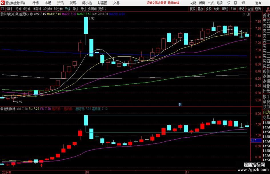 DRAWTEXT(CURRBARSCOUNT=8,高阴顶,STRCAT('',CON2STR(高阴顶,2))),COLORLICYAN;