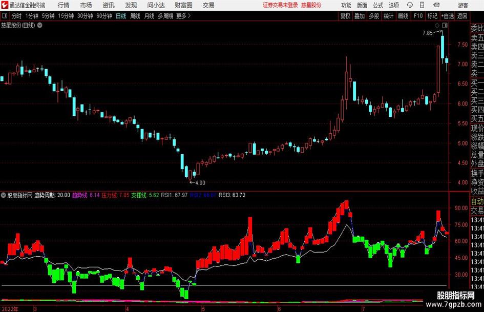 支撑线:LLV(LOW,趋势周期),COLORGREEN,LINETHICK1;