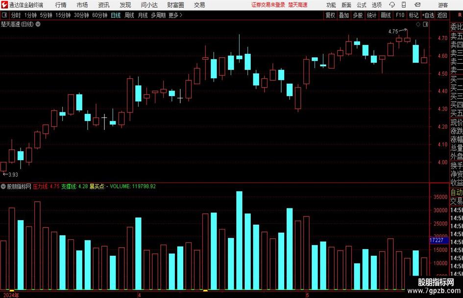 暴买点:IF(突破条件 AND COUNT(突破条件,M)=1,压力线*1.02,DRAWNULL),COLORYELLOW,POINTDOT,CROSSDOT,LINETHICK5;