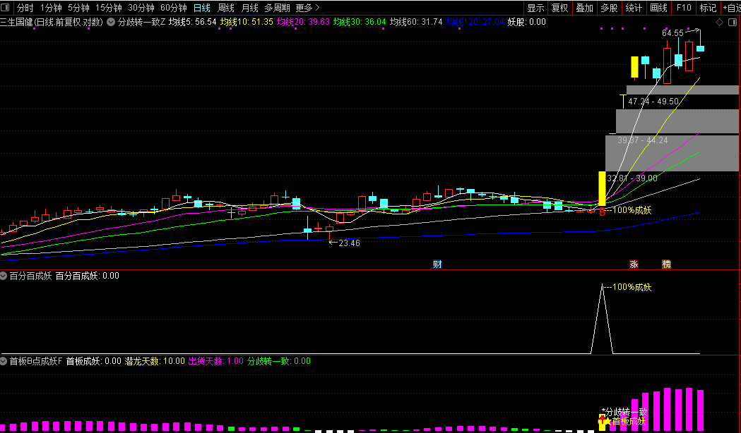 3. 当主图出现“100%成妖”信号,同时副图“分歧转一致”信号产生共振时,这便是极具确定性的买点。这种信号共振意味着市场对该股的关注度和预期正在快速转变,从分歧走向一致,预示着股票即将进入快速上涨的主升浪阶段,投资者可依据此信号果断进场,开启捉妖之旅。
