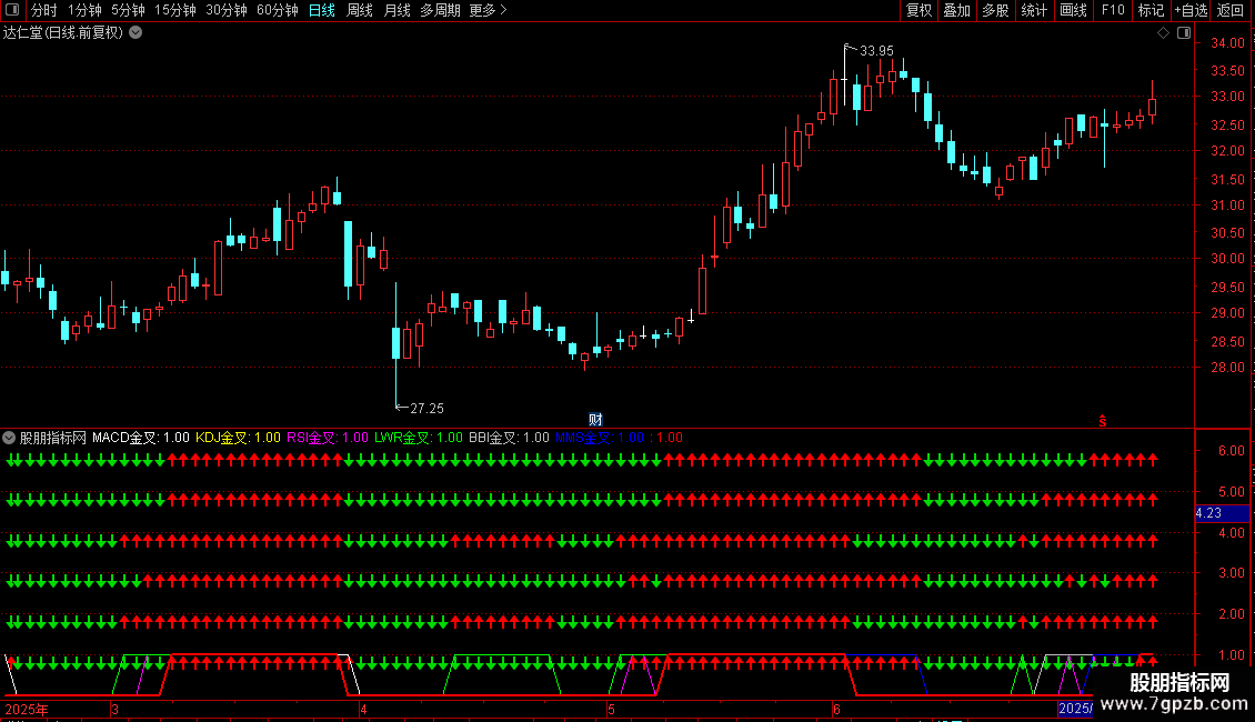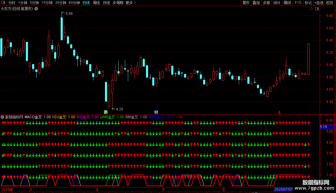MACD金叉 AND KDJ金叉 AND RSI金叉 AND LWR金叉 AND BBI金叉 AND MMS金叉,COLORRED,LINETHICK2;