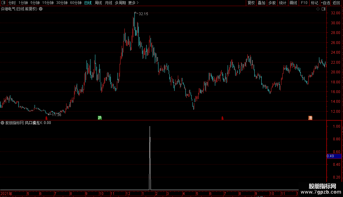 VAR18:=STICKLINE(VAR13>5 AND VAR1>VAR2 AND C>=EMA(C,5) AND VAR7-VAR8>0,0,-VAR15,2,0 );