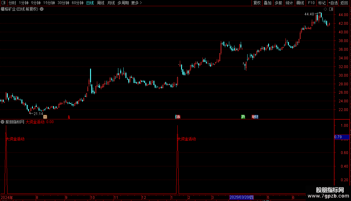 DRAWTEXT(VAR20 AND COUNT(VAR20,30)=1,0.8,'大资金活动'),COLORRED;