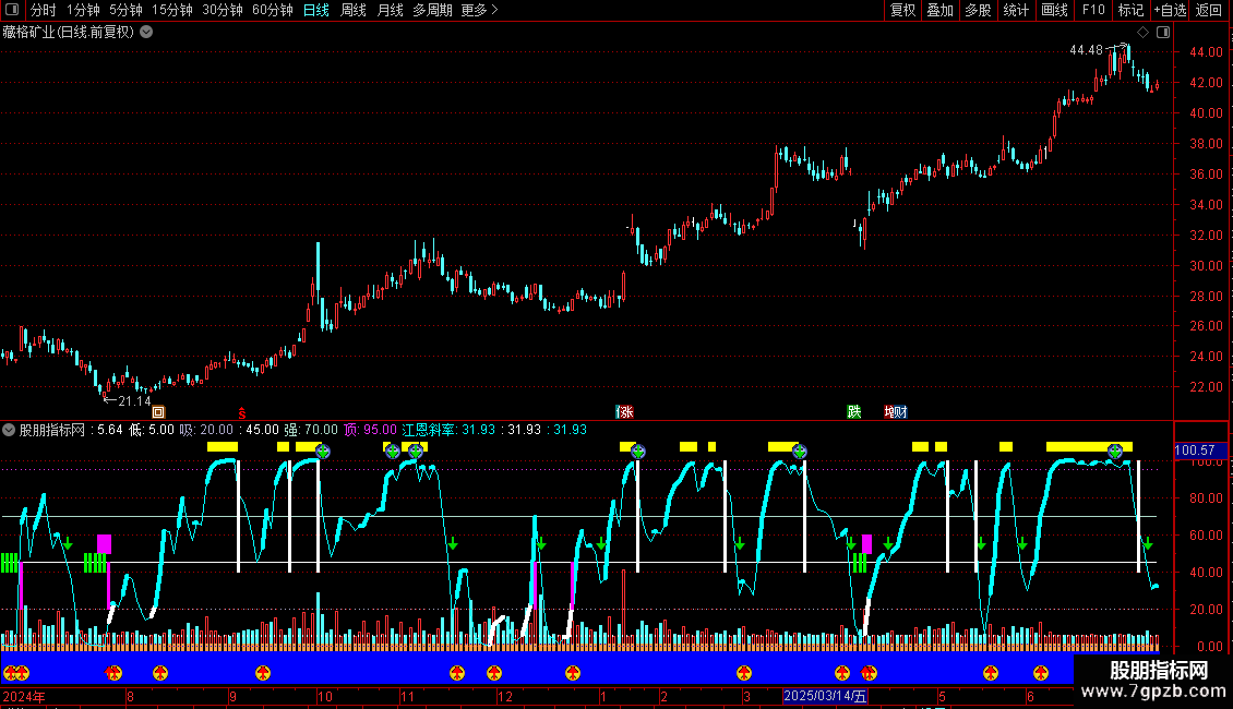 江恩斜率:EMA((C0-A2)/A3,2)*100,COLORFFFF00;