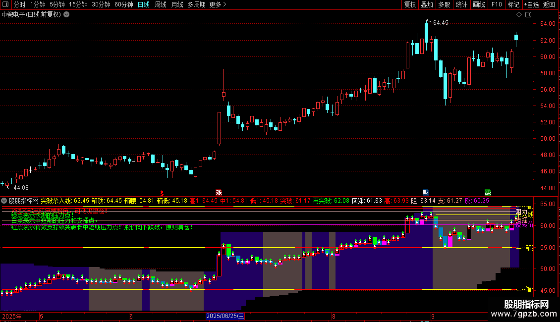 STICKLINE(买线>=卖线,HHV(H,60),LLV(L,60),5,0),