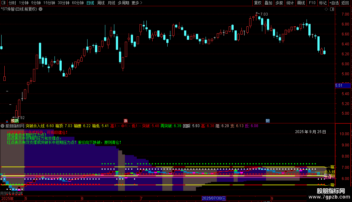 DRAWTEXT_FIX(CURRBARSCOUNT=1,0.02,0.10,0,'白点表示中短期的压力和支撑点,'),COLORGREEN;