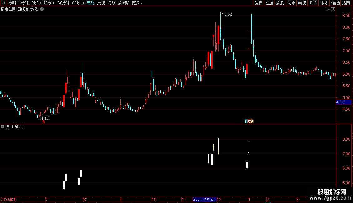 在主图指标中,红色实体代表“涨停板”,黄色“十字星”同时下方出现红色向上箭头的位置,就是信号发出的地方。