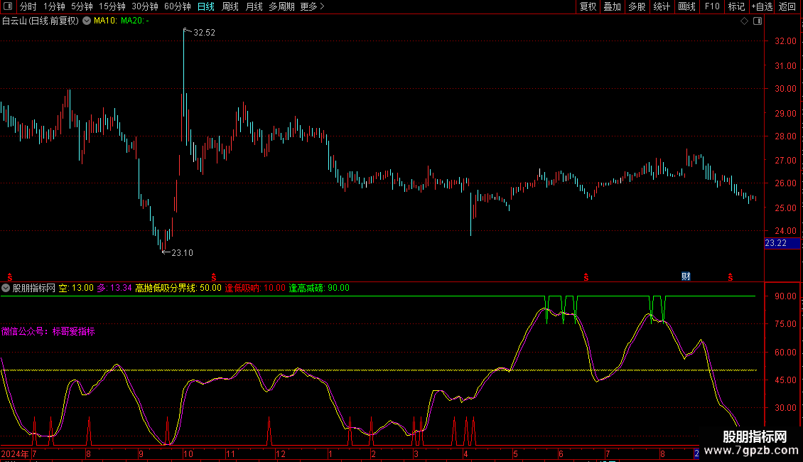 标哥爱指标:=IF(CROSS(BGE4,微信公众号) AND BGE4<40,25,10);