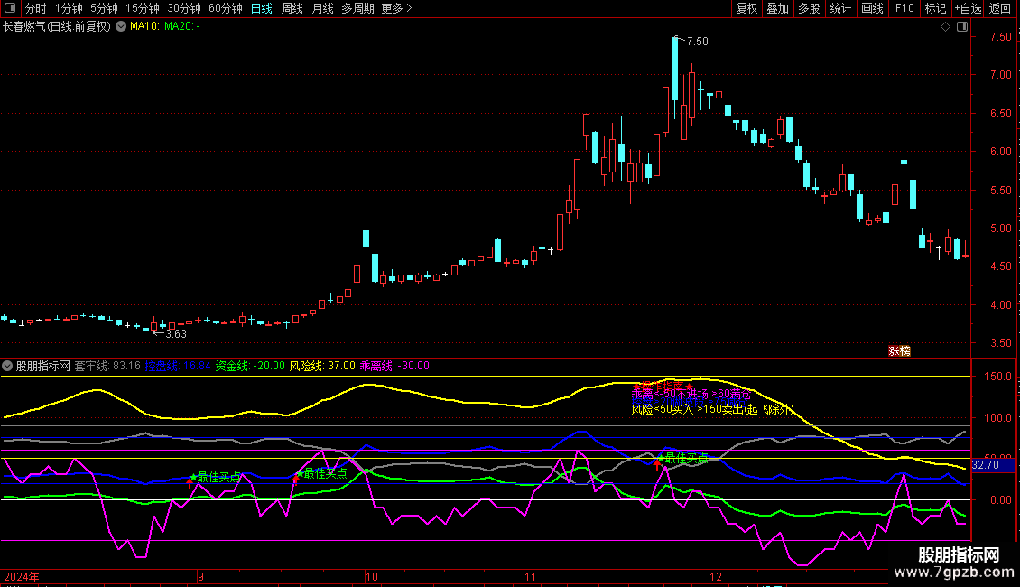资金线(绿色点线):转正且配合套牢线<90时触发最佳买点,显示资金流入;