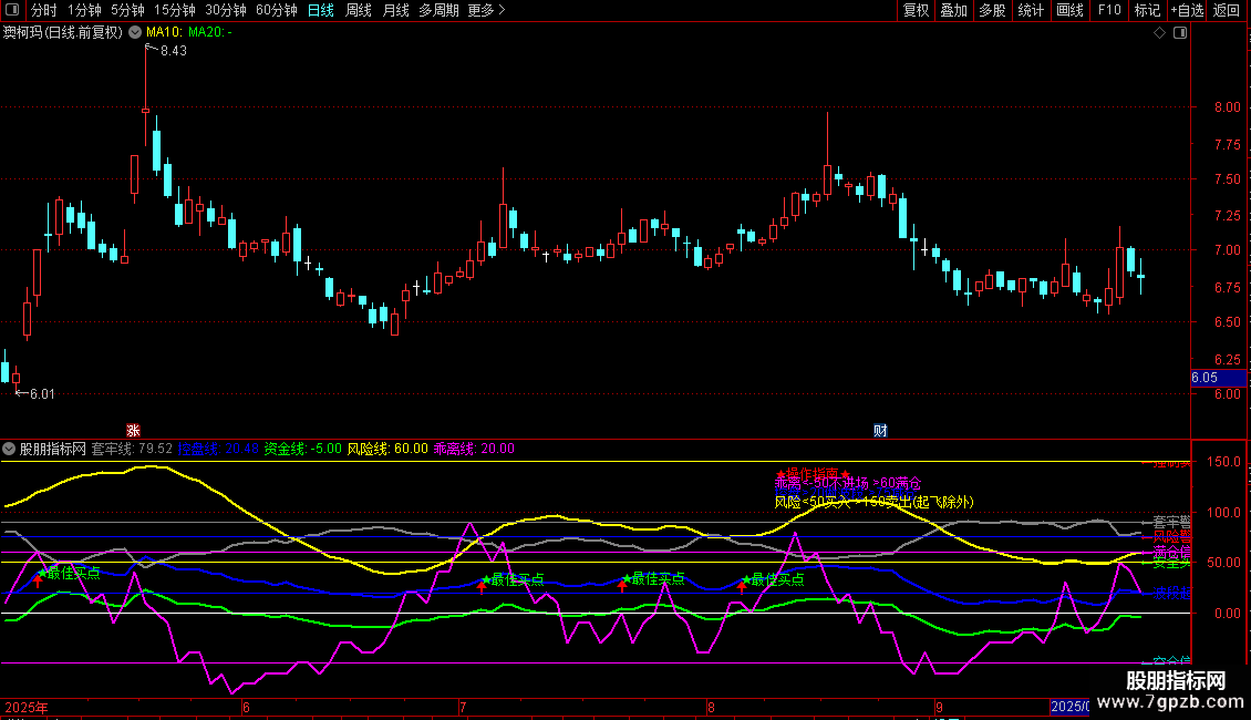 控盘线(蓝色实线):20以下为波段起点,75以上需减仓,衡量主力控盘强度;