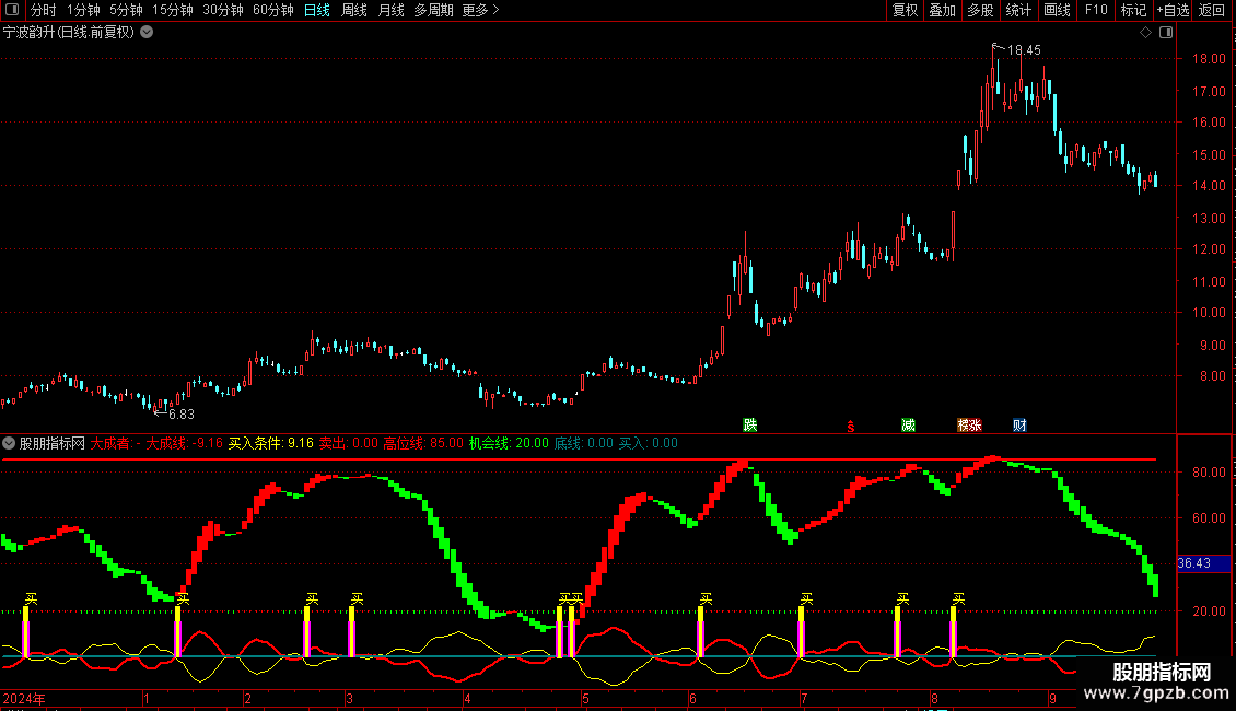 ZBGS1:=HHV(HIGH,9)-LLV(LOW,9);ZBGS2:=HHV(HIGH,9)-CLOSE;ZBGS3:=CLOSE-LLV(LOW,9);ZBGS4:=ZBGS2/ZBGS1*100-70;ZBGS5:=(CLOSE-LLV(LOW,60))/(HHV(HIGH,60)-LLV(LOW,60))*100;ZBGS6:=(2*CLOSE+HIGH+LOW)/4;ZBGS7:=SMA(ZBGS3/ZBGS1*100,3,1);ZBGS8:=LLV(LOW,34);ZBGS9:=SMA(ZBGS7,3,1)-SMA(ZBGS4,9,1);ZBGS10:=IF(ZBGS9>100,ZBGS9-100,0);ZBGS11:=HHV(HIGH,34);ZBGS12:=EMA((ZBGS6-ZBGS8)/(ZBGS11-ZBGS8)*100,8);ZBGS13:=EMA(ZBGS12,5);大成者:DRAWNULL,COLORRED;STICKLINE(ZBGS12>0 AND ZBGS12-ZBGS13>=0,19,20,0,0),COLORRED;STICKLINE(ZBGS12>0 AND ZBGS12-ZBGS13< 0,19,20,0,1),COLORGREEN;大成线:ZBGS12-ZBGS13,COLORRED,LINETHICK2;STICKLINE(ZBGS12-ZBGS13>0,ZBGS12,ZBGS13,2,0),COLORRED;买入条件:-大成线,COLORYELLOW;STICKLINE(ZBGS12-ZBGS13< 0,ZBGS12,ZBGS13,2,0),COLORGREEN;卖出:REF(大成线,1)>0 AND 大成线<=0 OR (大成线< 1 AND 大成线>=0 AND CLOSE< OPEN),COLORRED;高位线:85,COLORRED,LINETHICK2;机会线:20,NODRAW,COLORGREEN;底线:0,COLORLICYAN,LINETHICK2;买入:卖出=0 AND REF(大成线,1)< 0 AND 大成线>0,COLORLICYAN;STICKLINE(买入,0,22,2,0),COLORYELLOW;加仓:STICKLINE(买入,0,15,5,0),COLORMAGENTA;STICKLINE(买入,0,15,1,0),COLORYELLOW;DRAWTEXT(买入,25,'买'),COLORYELLOW;