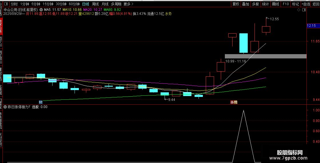 指标通过竞价量比(当前竞价量/昨日成交量)筛选超10%的爆量个股,结合昨日涨停、竞价涨幅(>2%)、流通市值适配等条件,剔除ST及创业板/科创板股票,最终选出竞价强势的涨停接力标的。操作策略:开盘前监控符合条件个股,结合市场情绪择机参与。