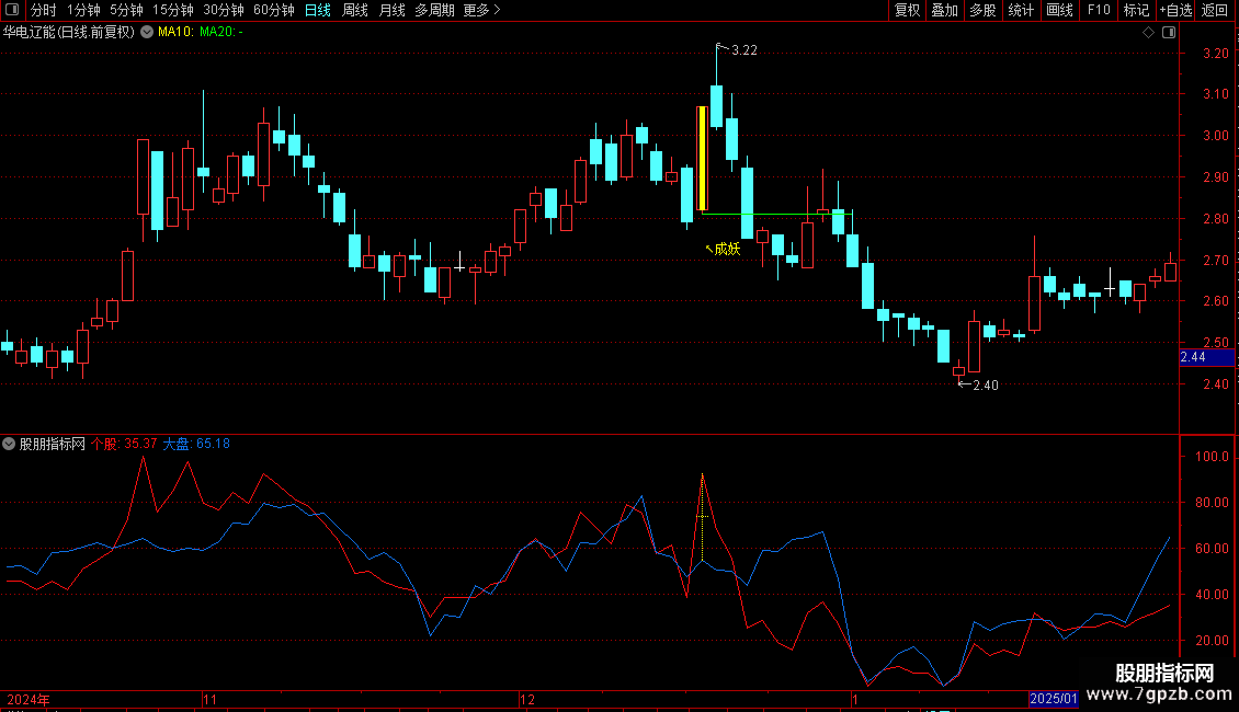 指标通过个股与大盘的相对强弱对比捕捉超买机会。个股线(蓝色)衡量股价在34日内的相对位置,大盘线(橙色)反映指数同期表现。当个股线突破90且20日内首次出现,同时满足前期涨幅温和(10日内单日涨幅<11%)、近期低位(20日内最低值<30)、持续强于大盘(20日内超10天)时,触发黄色信号柱。操作上:黄柱出现为短线买入信号,结合MACD(绿线)趋势确认更佳。