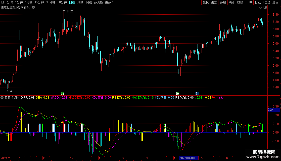 输出MACD顶背:如果D1>0,返回0.1,否则返回0,COLOR00FF00,POINTDOT