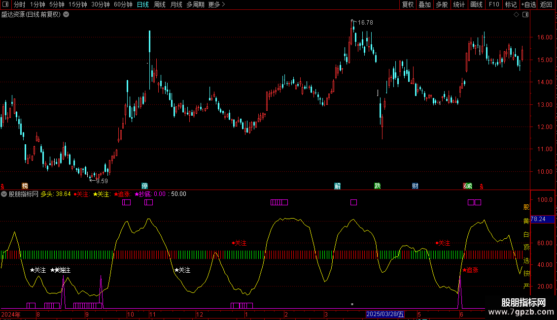★关注: DRAWTEXT(REF(CROSS(慢线,多头),82) AND 慢线>1.3*多头,35,'★关注'),LINETHICK1;