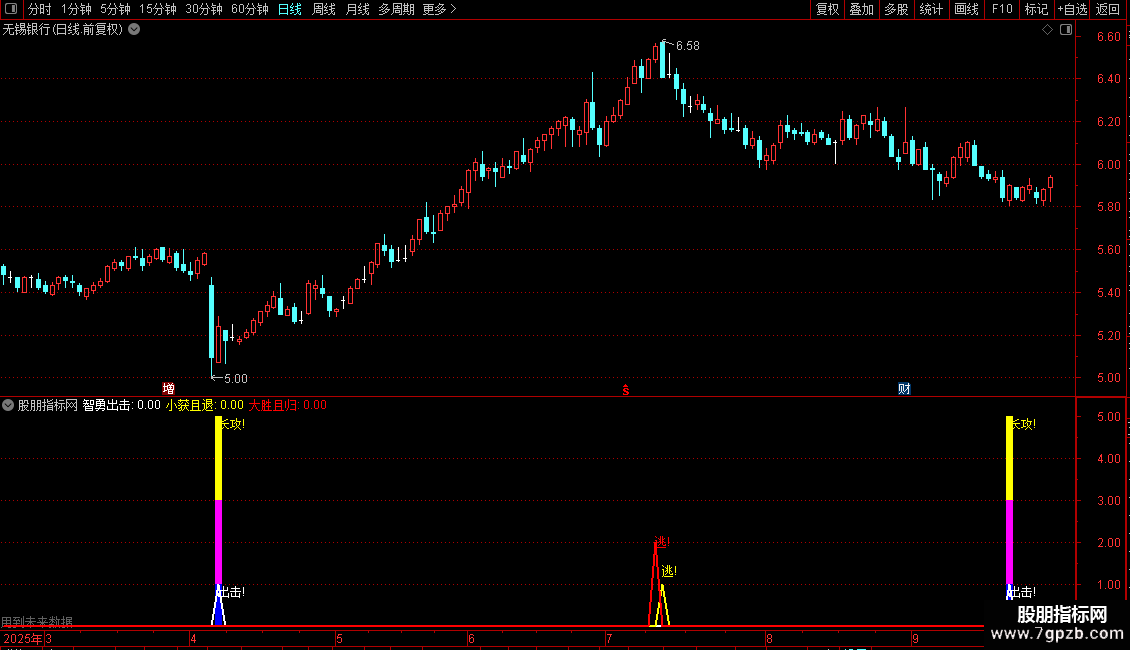 智勇出击: ZIG(3,6)>REF(ZIG(3,6),1)AND REF(ZIG(3,6),1)<REF(ZIG (3,6),2),COLORWHITE,LINETHICK2; DRAWTEXT(智勇出击=1,0.8,'出击!'),COLORWHITE;