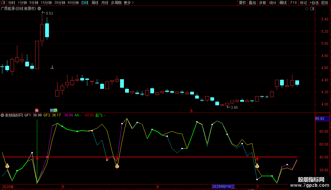 STICKLINE(REF(QF2,1)<40 AND CROSS(40,QF1),QF1,98,0,1),COLORGREEN,LINETHICK2;