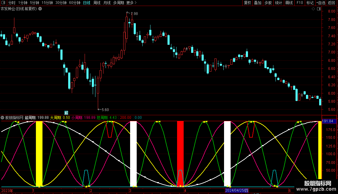 STICKLINE(短周期<5 AND 小周期>195,小周期,短周期,5,0),COLORWHITE;