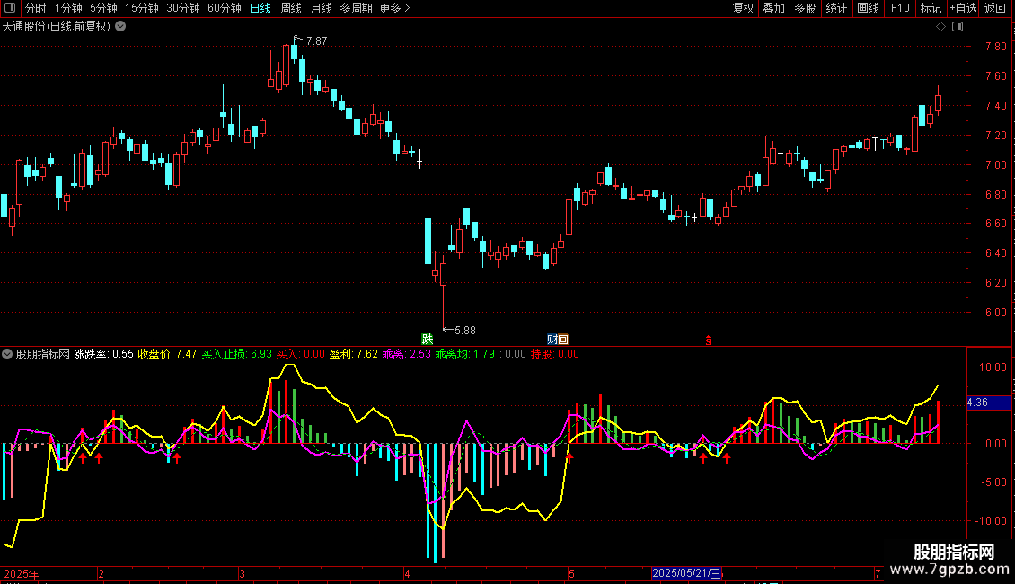STICKLINE(涨跌率<0,0,涨跌率*10,0.1,0),COLORCYAN;