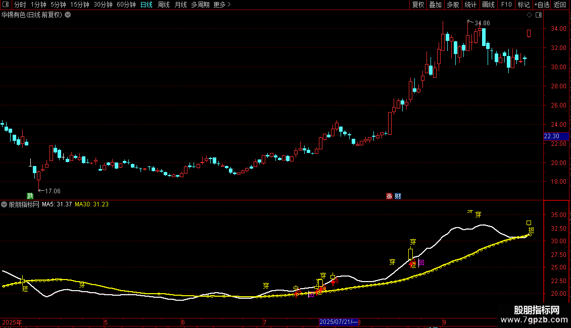 输出 MA30:收盘价的30日简单移动平均,画黄色,线宽为2