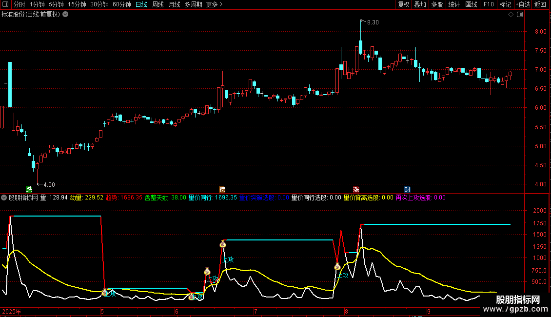 DRAWTEXT(量价突破选股>0,(量*0.699),'上攻'),COLORCYAN;
