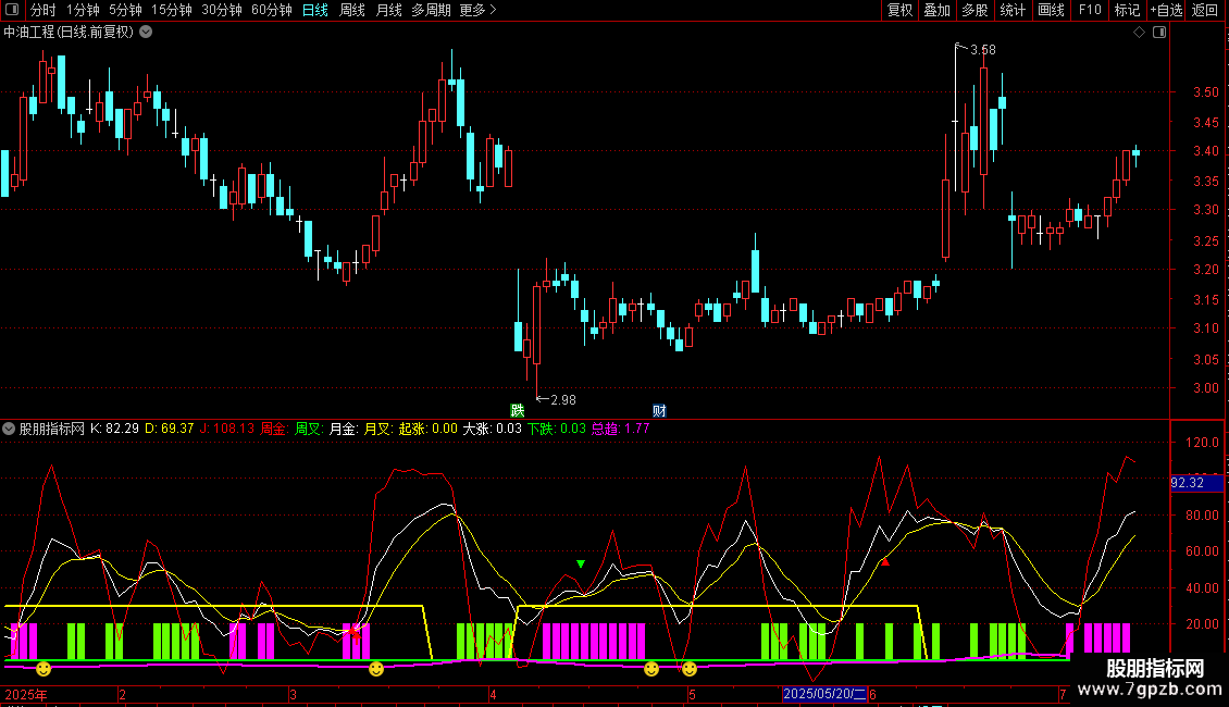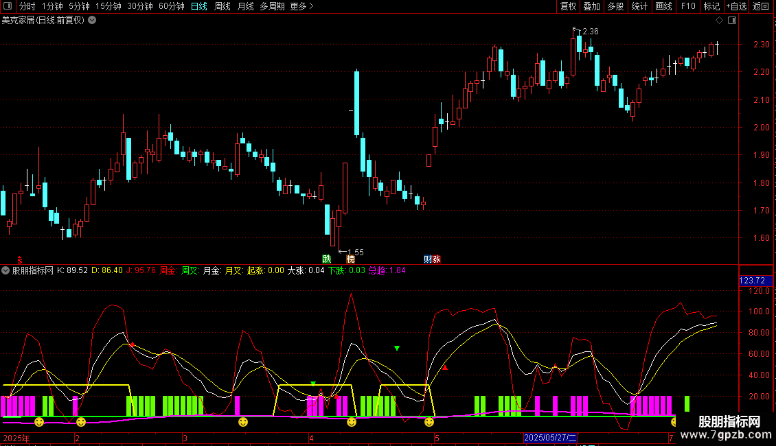 月金:DRAWTEXT(CROSS(REF(月K,1),REF(月D,1)) ,D,'▲'),COLORWHITE;