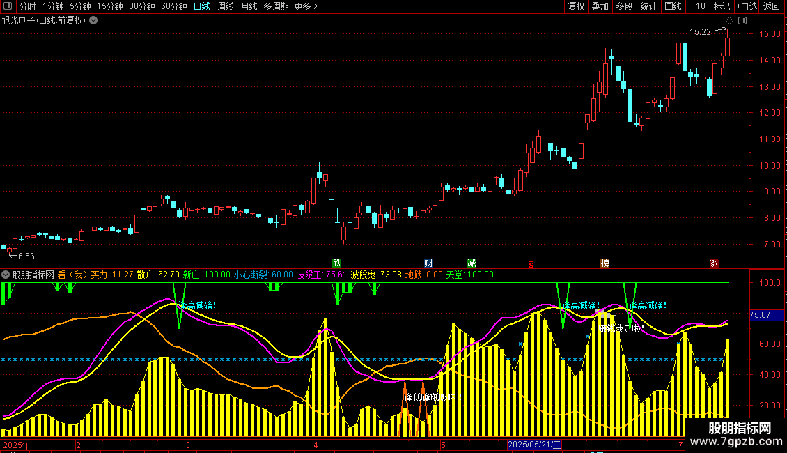 DRAWTEXT(CROSS(波段鬼,波段王) AND 波段鬼>75,85,'逢高减磅!'),COLORFFFF00 , ;