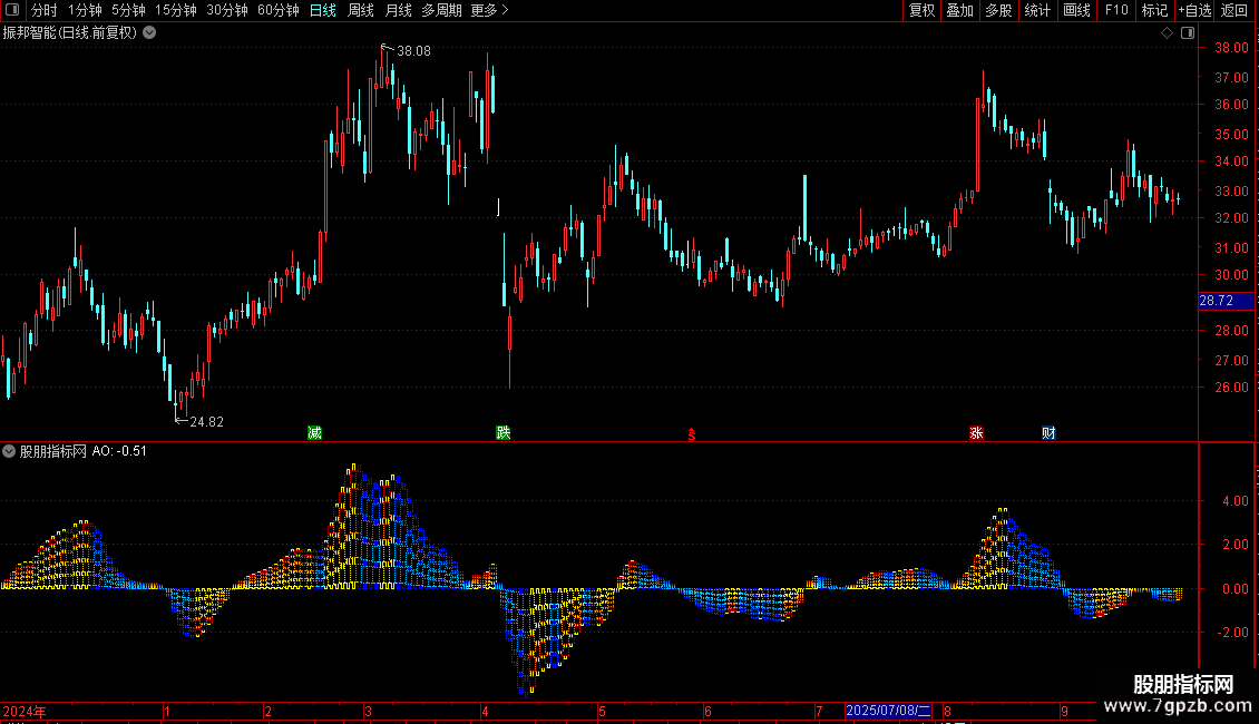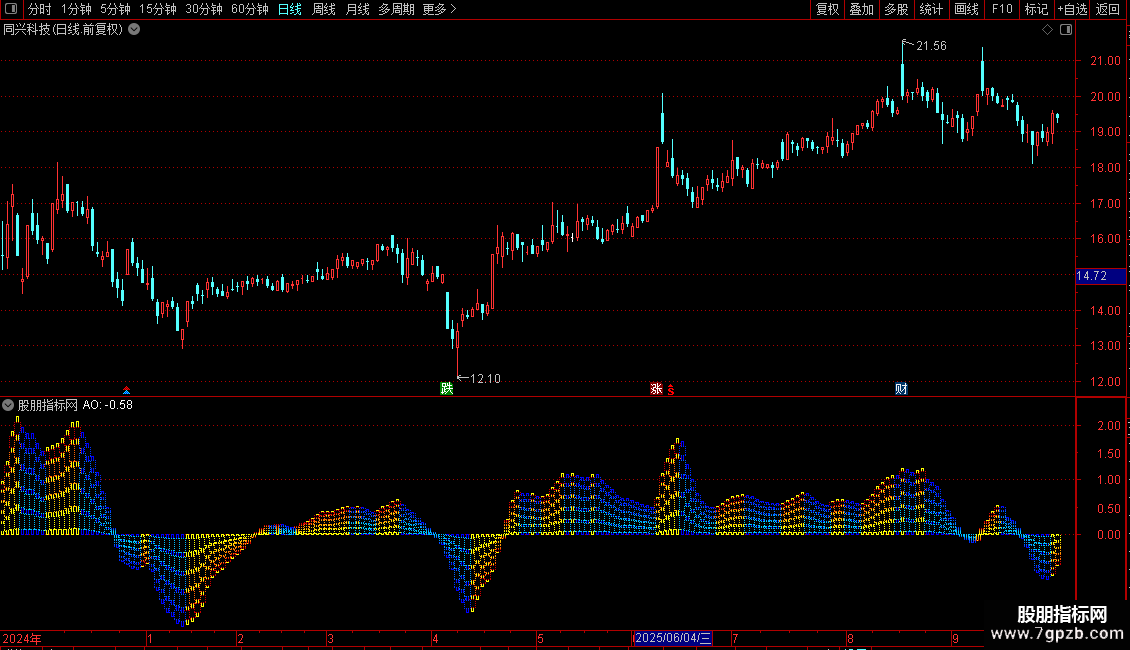 STICKLINE(AO>=REF(AO,1),(AO-AO*0.6),(AO-AO*0.75),5,-1) COLOR00CCFF;