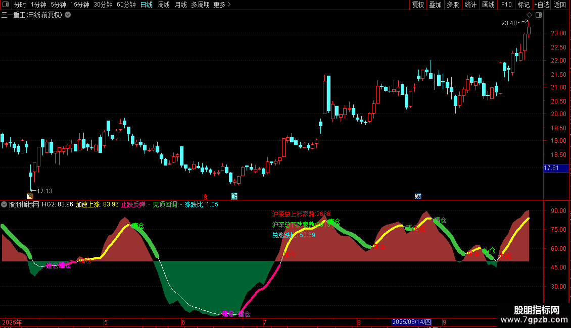 上涨趋势:=IF(HG1>50,HG1,DRAWNULL),COLORRED;