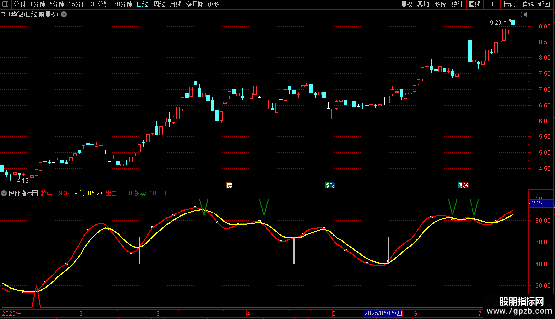 短卖:IF(CROSS(人气,趋势) AND (人气>75),85,100),COLOR008000,LINETHICK2;