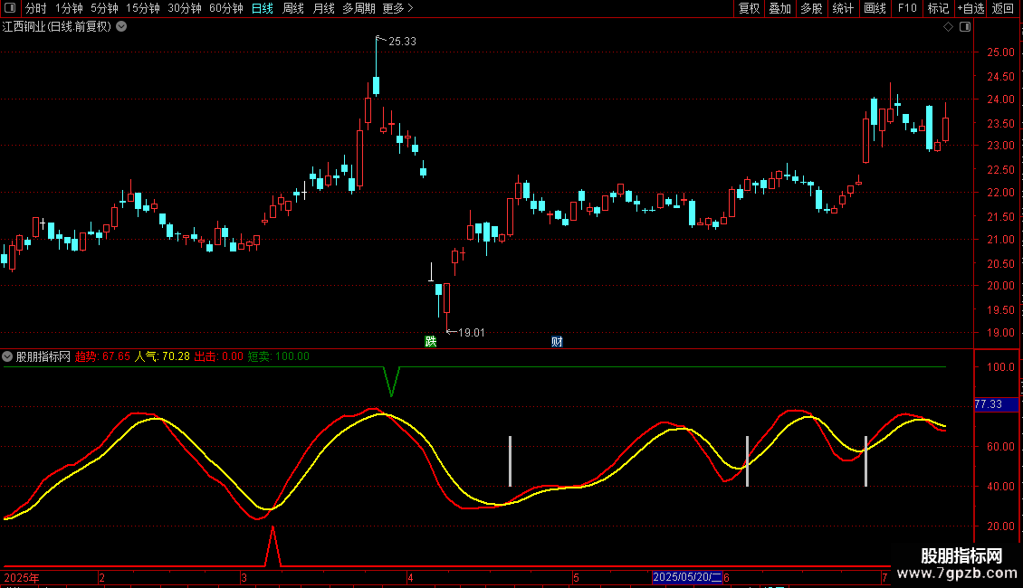 出击:IF(CROSS(趋势,人气) AND (趋势<30),20,0),COLOR0000FF,LINETHICK2;
