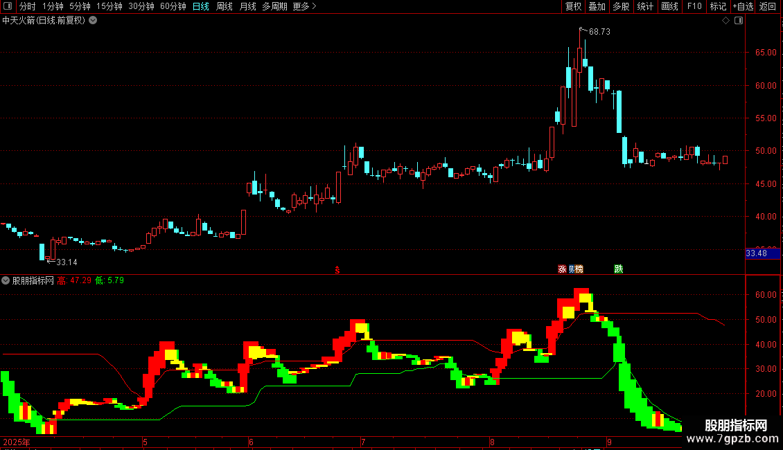 介必升:=(CLOSE-LLV(LOW,21))/(HHV(HIGH,21)-LLV(LOW,21))*1.2*CLOSE;老介1:=EMA(介必升,4);老介2:=EMA(介必升,6);老介3:=EMA(介必升,8);STICKLINE(老介1>=老介2,老介3,老介1,8,0),colorred;STICKLINE(老介1>=老介2,老介3,REF(老介1,1),5,0),colorred;STICKLINE(老介1<老介2,老介3,老介1,8,0),colorgreen;STICKLINE(老介1<老介2,老介3,REF(老介1,1),3,0),colorgreen;T1:=老介2>=老介3 AND 老介1<REF(老介1,1);T2:=老介2<老介3 AND 老介1>REF(老介1,1);STICKLINE(T1,老介1,老介3,8,0),COLOR00FFFF;STICKLINE(T1,老介1,REF(老介3,1),3,0),COLOR00FFFF;STICKLINE(T2,老介1,老介3,8,0),coloryellow;STICKLINE(T2,老介1,REF(老介3,1),3,0),colorred;高:HHV(EMA(介必升,13),21),colorred,Linethick1;低:LLV(EMA(介必升,10),21),colorgreen,Linethick1;