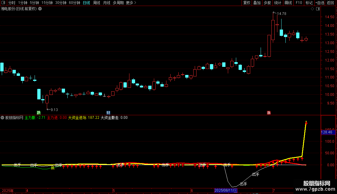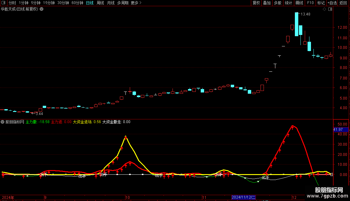 大资金进场:IF(VB>=0,VB*2,0),COLORYELLOW,LINETHICK3;