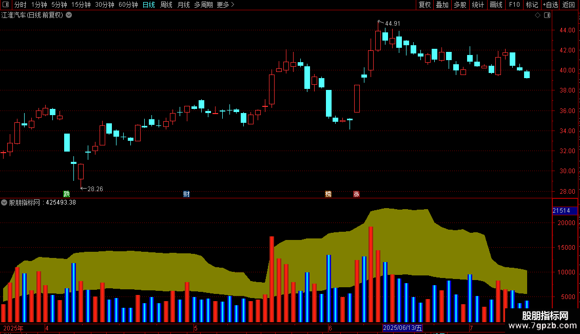 STICKLINE(CLOSE>=OPEN,0,V,1.0,0) ,COLOR1020DD;
