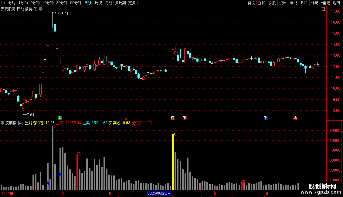 DRAWTEXT (VOL<MA(VOL,5)/2 AND V<V12/2,(V5+V)/2,'地'),COLORBLUE;