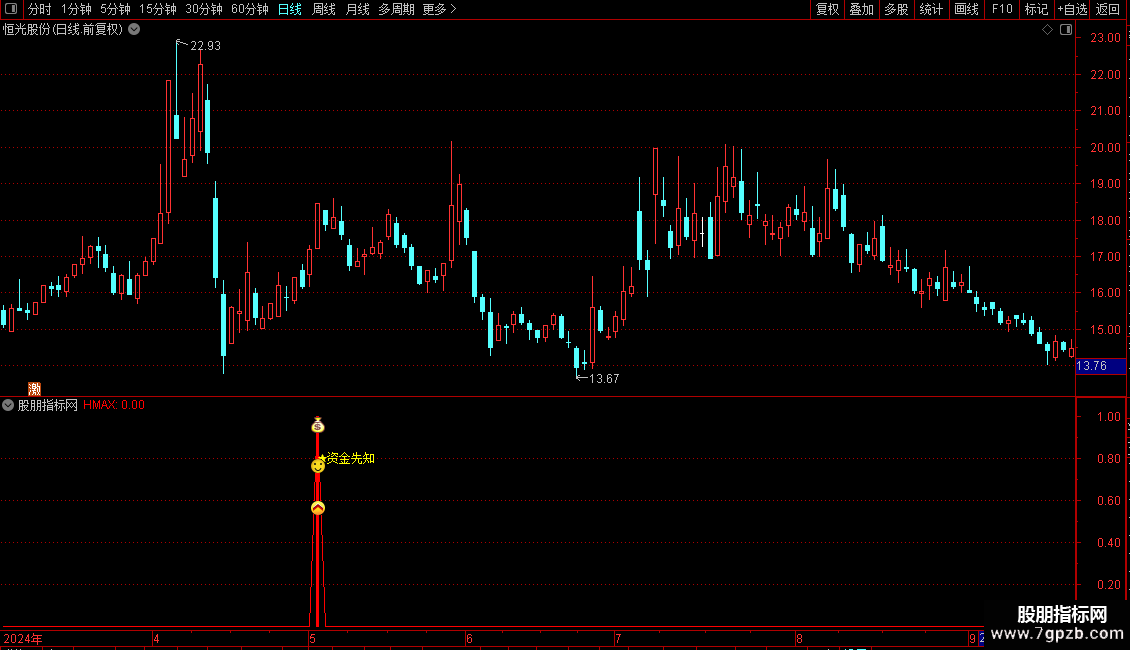 DRAWTEXT(HMAX,0.8, '★资金先知'),COLORYELLOW LINETHICK6;