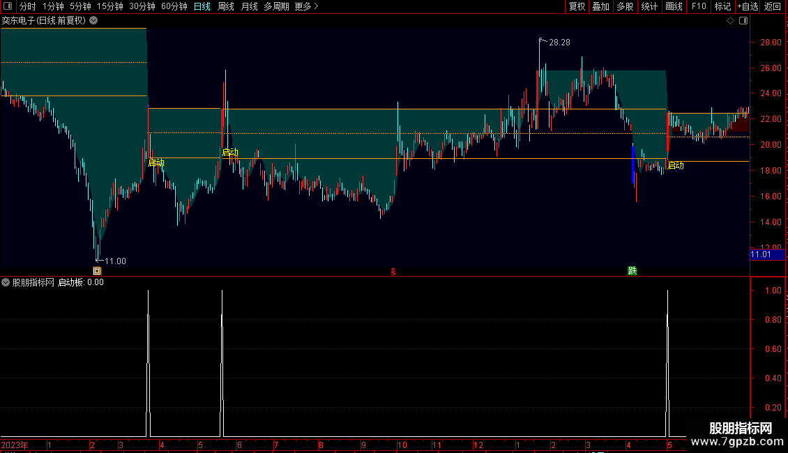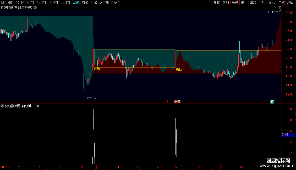 启动板:FILTER(MAXBYH<REF(MAXBYH,1) AND C>REF(L,1),5);