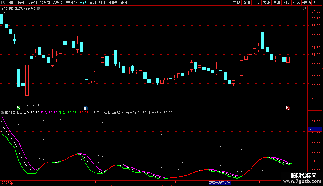 输出 牛市成本:获利盘为34%的成本分布的3日指数移动平均,线宽为2,POINTDOT