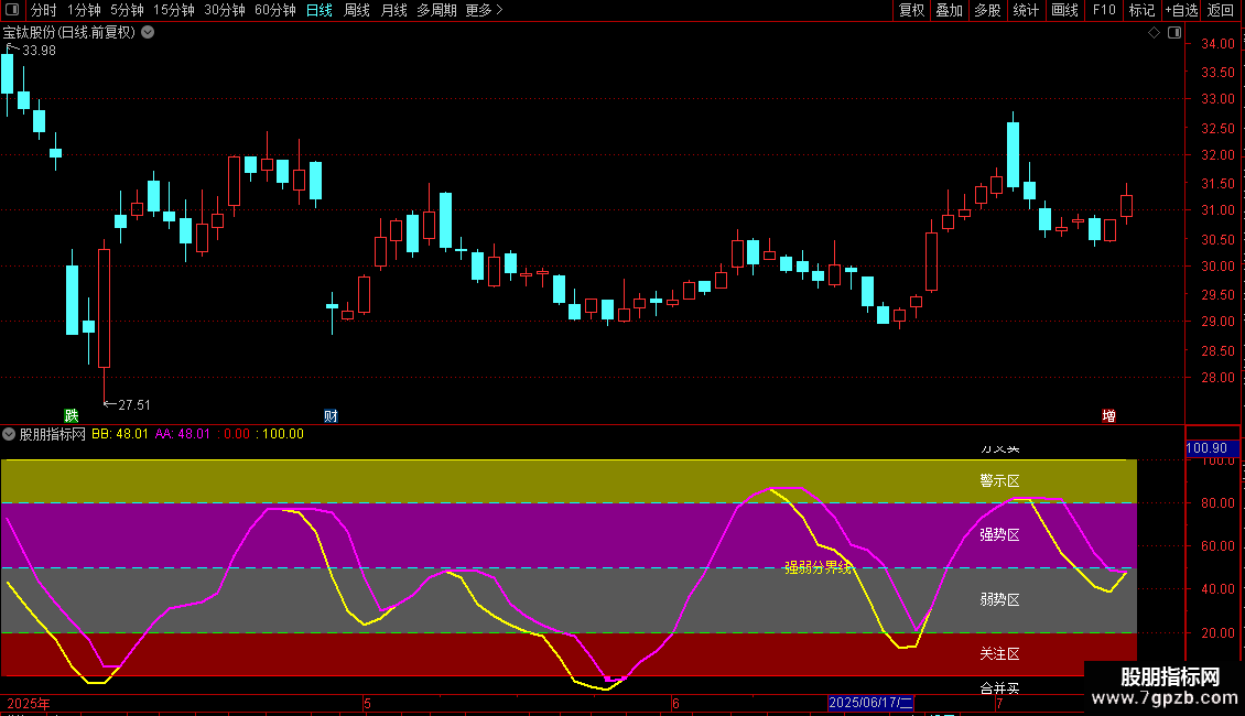 DRAWTEXT(CURRBARSCOUNT=22,50,'强弱分界线'),COLOR00FFFF;